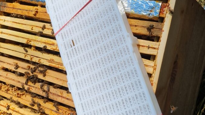 En été, nous provoquons une rupture de ponte en encageant les reines. En absence de couvain, le varroa ne peut se reproduire et peut être facilement atteint.